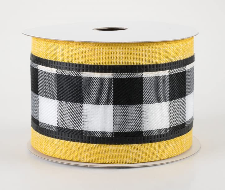 2.5 inches wide, wired, black buffalo and yellow ribbon great for holiday projects and decorating. 30 feet long.