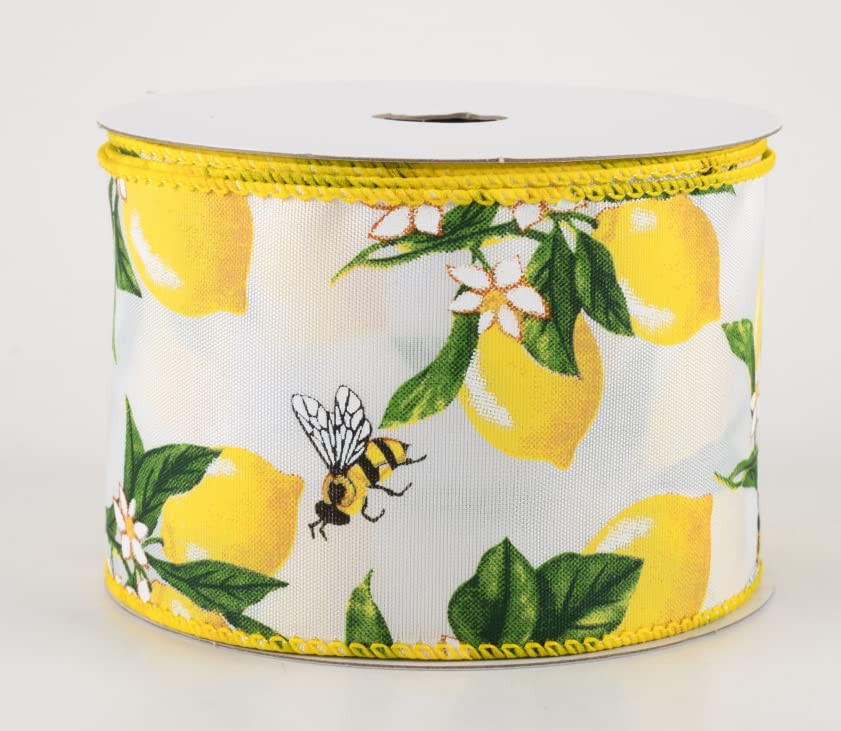 - 2.5 inches wide Satin Lemons with Bee Wired Ribbon