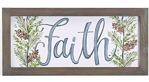 Decoupaged "faith" wall hanging with brown wooden frame. Has two sawtooth hangers on the back for hanging. 8"H X 17"W