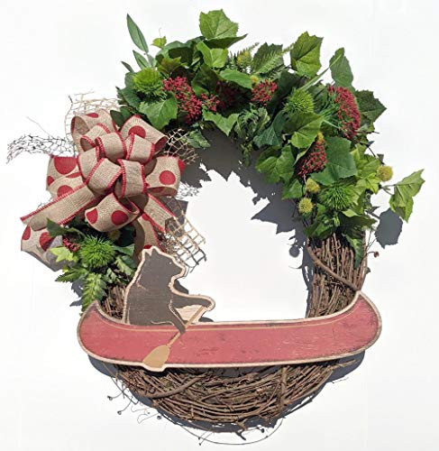This adorable bear is merrily canoeing in his canoe! What a cute wreath for a rustic setting! Made on a 24" grapevine wreath, features a wooden bear and his canoe. Natural red polka dot bow. Greens on top feature red flowers.