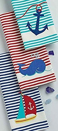18 x 28". 100% Cotton. Machine wash cold separately, gentle cycle, tumble dry low. Includes one whale, sailboat and anchor dishtowel.