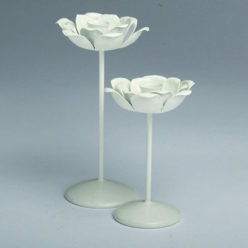 Let spring bloom. Taper holder set is crafted from powder-coated metal petals that give the appearance of a flower in bloom. Makes a verdant statement. Metal tall: 8.5"h x 4.25" dia; short: 6.25"h x 4.25" dia. Use with standard-size taper or straight candles only (not included).