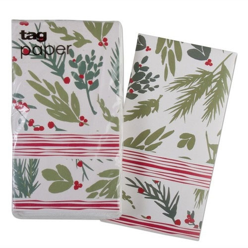 Get ready for your Christmas party with Tag's and affordable paper hostess/buffet napkins. tag paper is an easy alternative to your holiday dinnerware. These paper napkins are a stylish way to keep crumbs away. Plus, tag paper makes cleanup a breeze. Christmas greenery stripe design is an elegant and beautiful complement to your Christmas party decor. 3-ply paper printed with water-based inks. 7.75" x 4.25" (folded).