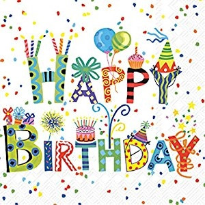 Celebrate that special birthday with these great Happy Day napkins. Soft, triple-ply paper napkins come 20 napkins per pack. Folded size: 5â³ x 5â³. Luncheon napkins and dinner & dessert plates also available.