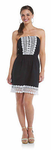 Slub cotton strapless dress with elasticized waist features crochet lace trim at bodice and hem. Hits at a modest mid thigh. Cinches at natural waist.