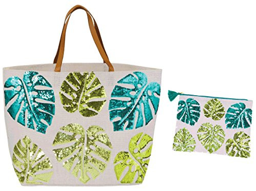 Palm leaf jute tote features applied sequin artwork, cotton webbing handles, laminated wipe-clean interior and inner pouch pocket. Comes with matching zipper bag for wet bathing suits or cosmetics, etc.