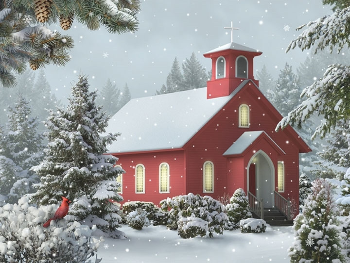 Beautiful winter print of a church that lights up. Made of Polyester Canvas. Measures 18" X 24". Requires 3 AA Batteries. Corner Button Activated. Artist: Alan Giana.