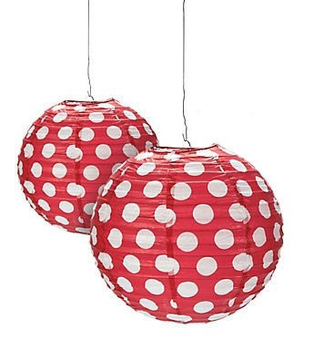 These 12" round paper lanterns feature red and white polka dots. Perfect for any celebration. Held open with a wire expander. Sold in a set of 2.
