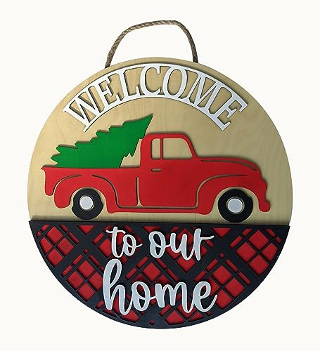 Red Truck Welcome Hand Painted Wooden Sign with Hanger. 16 inches in diameter.