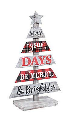 Perfect for Christmas decorations, this tree comes decked out in a buffalo plaid pattern and features a festive saying. Made of wood. 15" x 23 1/2". Simple assembly required.