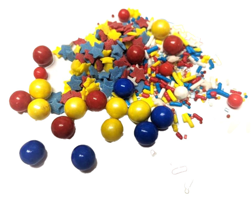 Three different sprinkle to decorate your little Super Hero's party! Chocolate filled color coordinated sixlets, Sprinkle mix and color coordinated stars. 2 oz each.