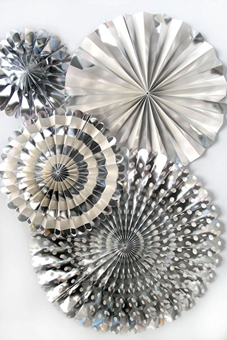 Use these Elegant Silver Foil and Cream Fans to decorate your Candy Bar for a wedding, anniversary or shower. You get four fans to adorn your wedding or event! Perfect for any party or festive occasion! Sophisticated, modern and chic these dazzling party fans are a hit at any party or in any photo booth. Each unfolds into a full circle and includes an adhesive strip to hold them open, as well as a string for hanging. Adhesive circles for mounting are also included. The fans measure 8", 11", 14", and 17" in diameter. These fans are durable enough to use over and over again!