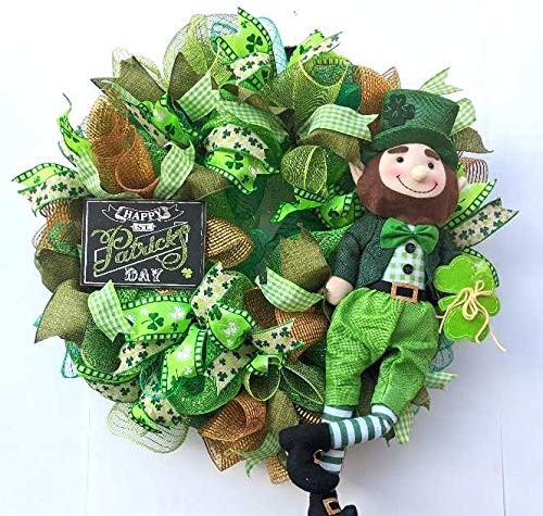 This wreath is gorgeous for St Patrick's Day! One of a kind! 26" in diameter. Made from deco mesh on a metal frame, it's filled with brightly colored high quality ribbon with a gorgeous plush Leprechaun and St Patrick's Day wooden sign. This wreath is will truly last for years. Perfect for indoor, or an outdoor covered area only.