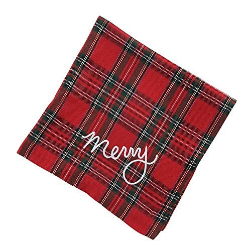 Set of 4. Red tartan cloth napkins feature applied twill tape "Merry" sentiment.