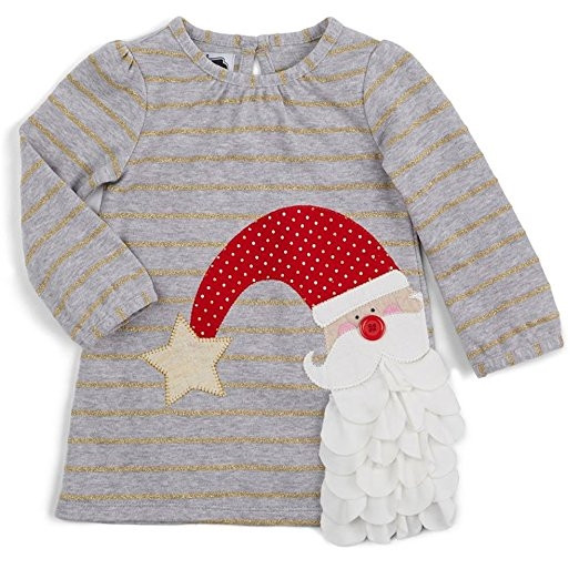Yarn dyed cotton interlock dress with keyhole back features Santa applique with layered jersey beard with red button nose and gold linen star detail.