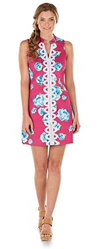 Cotton/spandex shift dress features standing collar, embroidered detail along front V-neck placket and center bodice and side vents at hem. Invisible zipper at side seam. Measures approximately 35 1/2" from shoulder to hem on size small. Little girls sizes also available and sold separately.